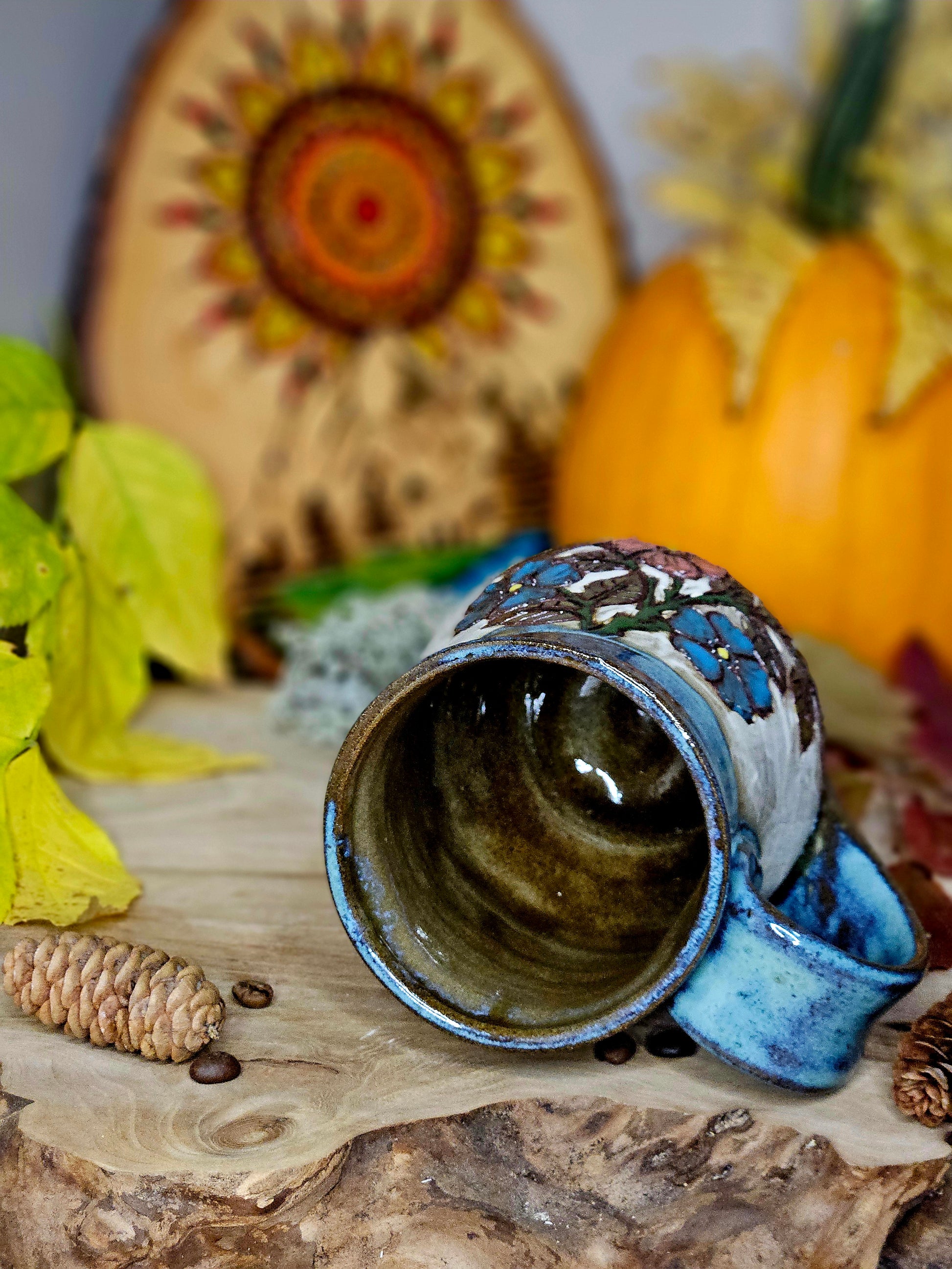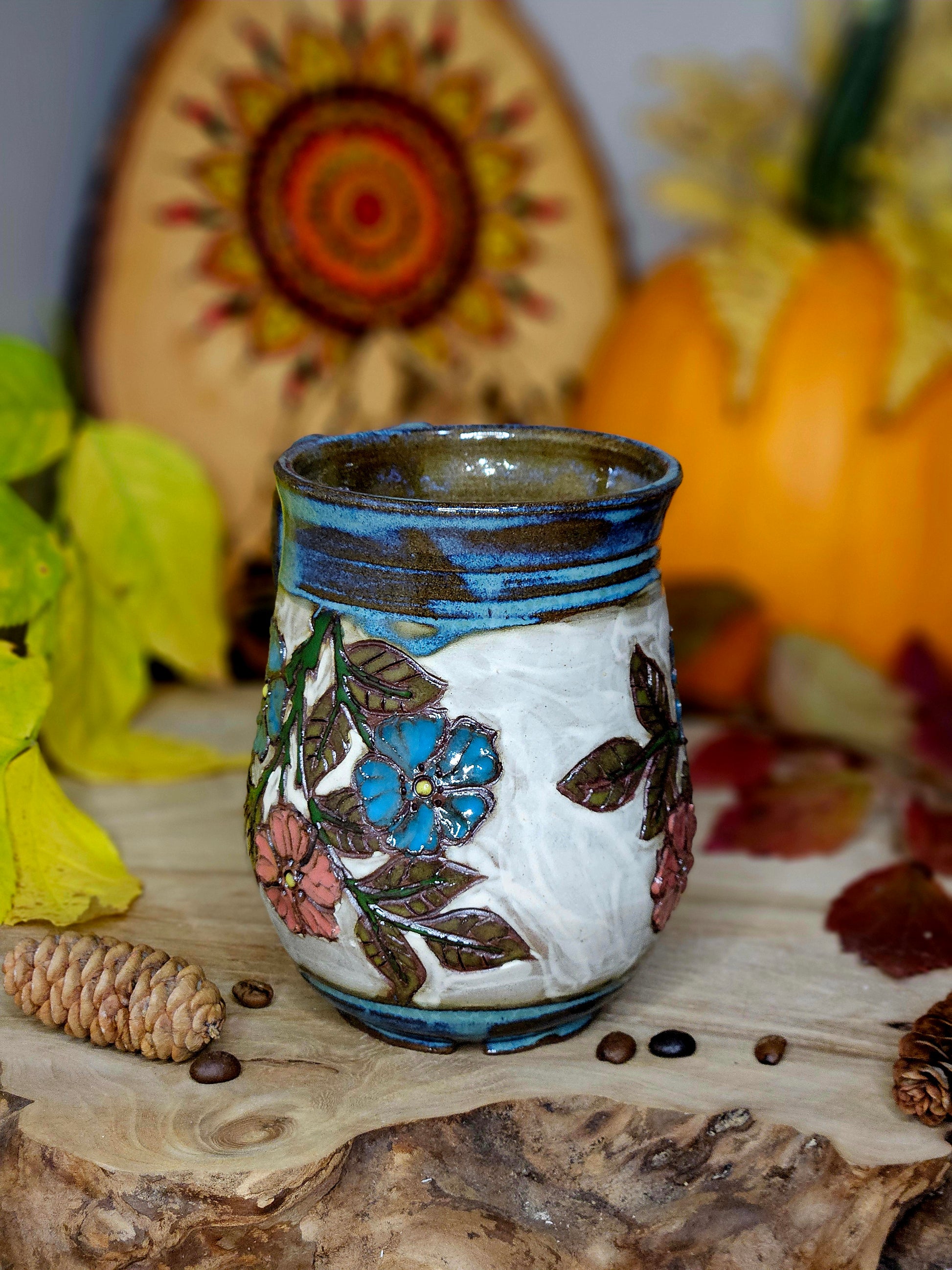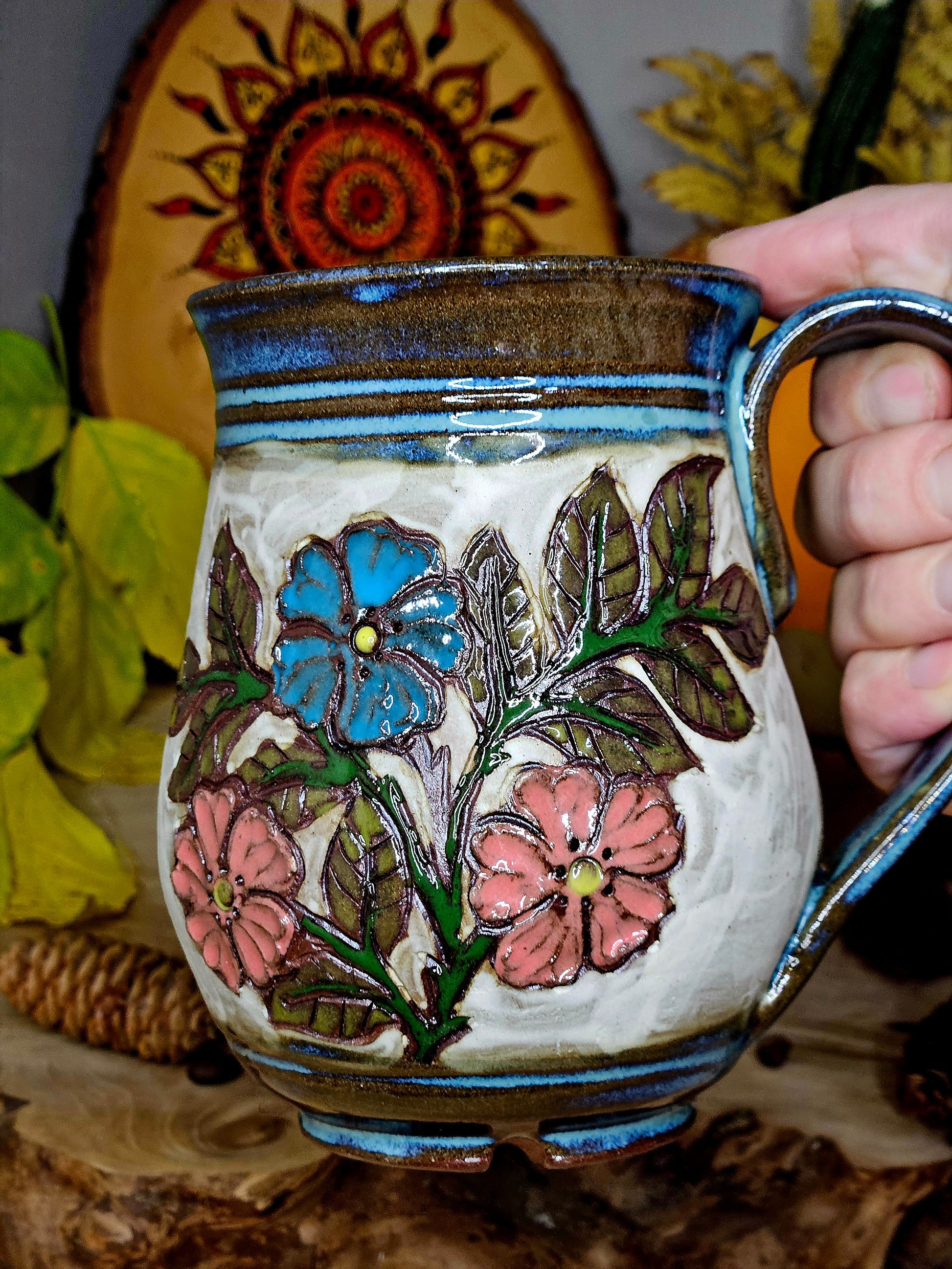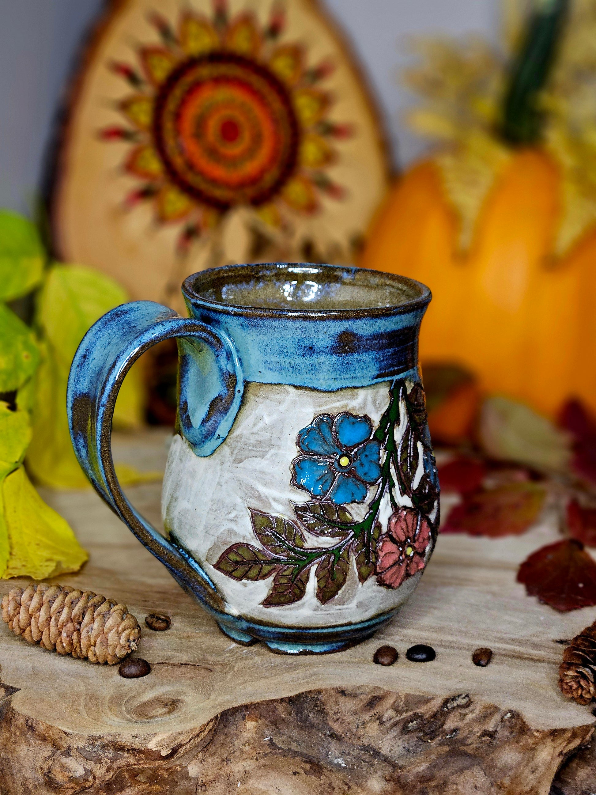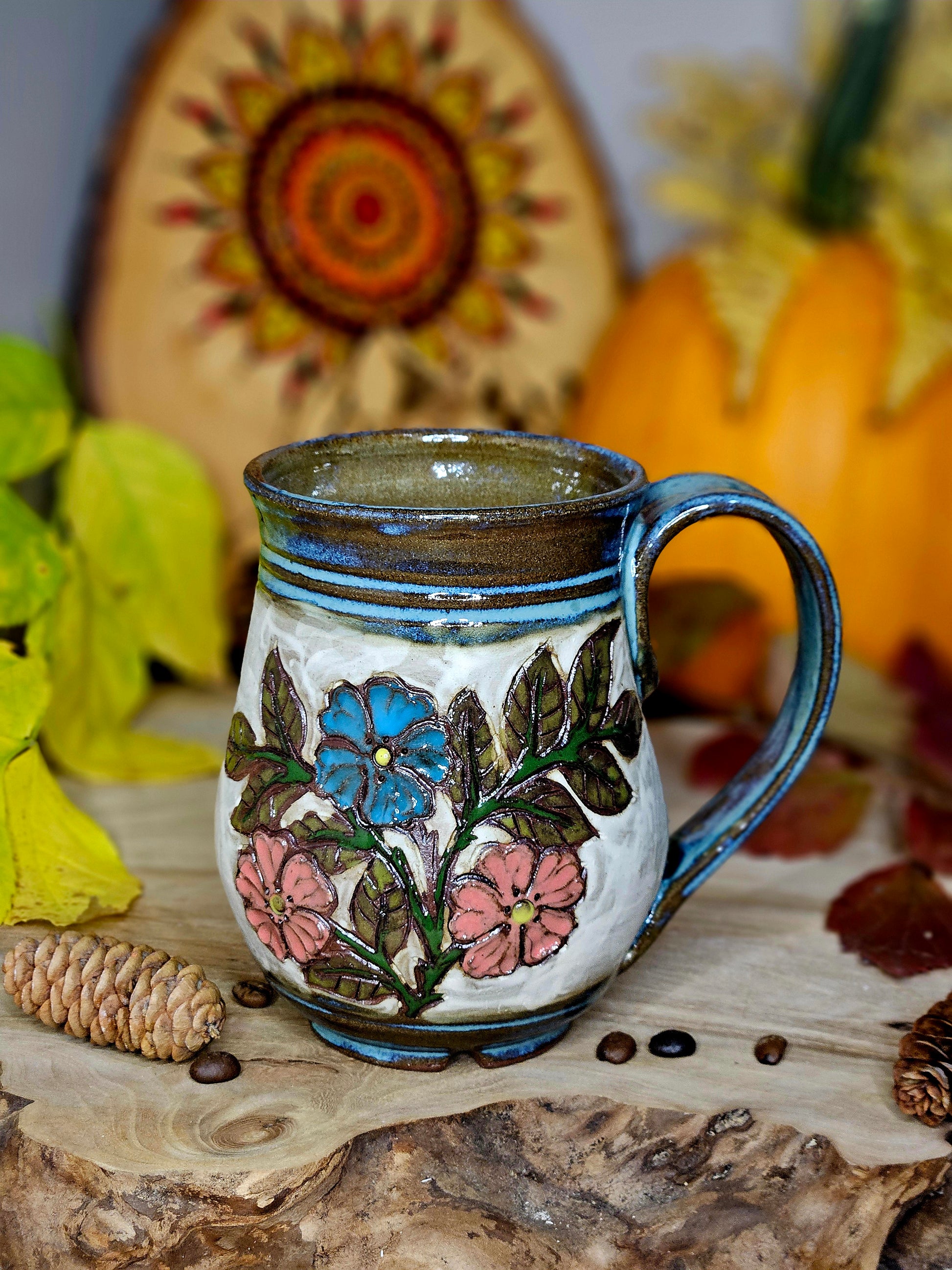 Elevate your coffee ritual with this handcrafted pottery mug. Each mug boasts 4-8 hours of custom art work, making every piece one-of-a-kind. Its ergonomic handle and generous capacity (13-16oz) provide both comfort and functionality. Perfect for cozy mornings or afternoon tea, this mug adds artisanal charm to any home.