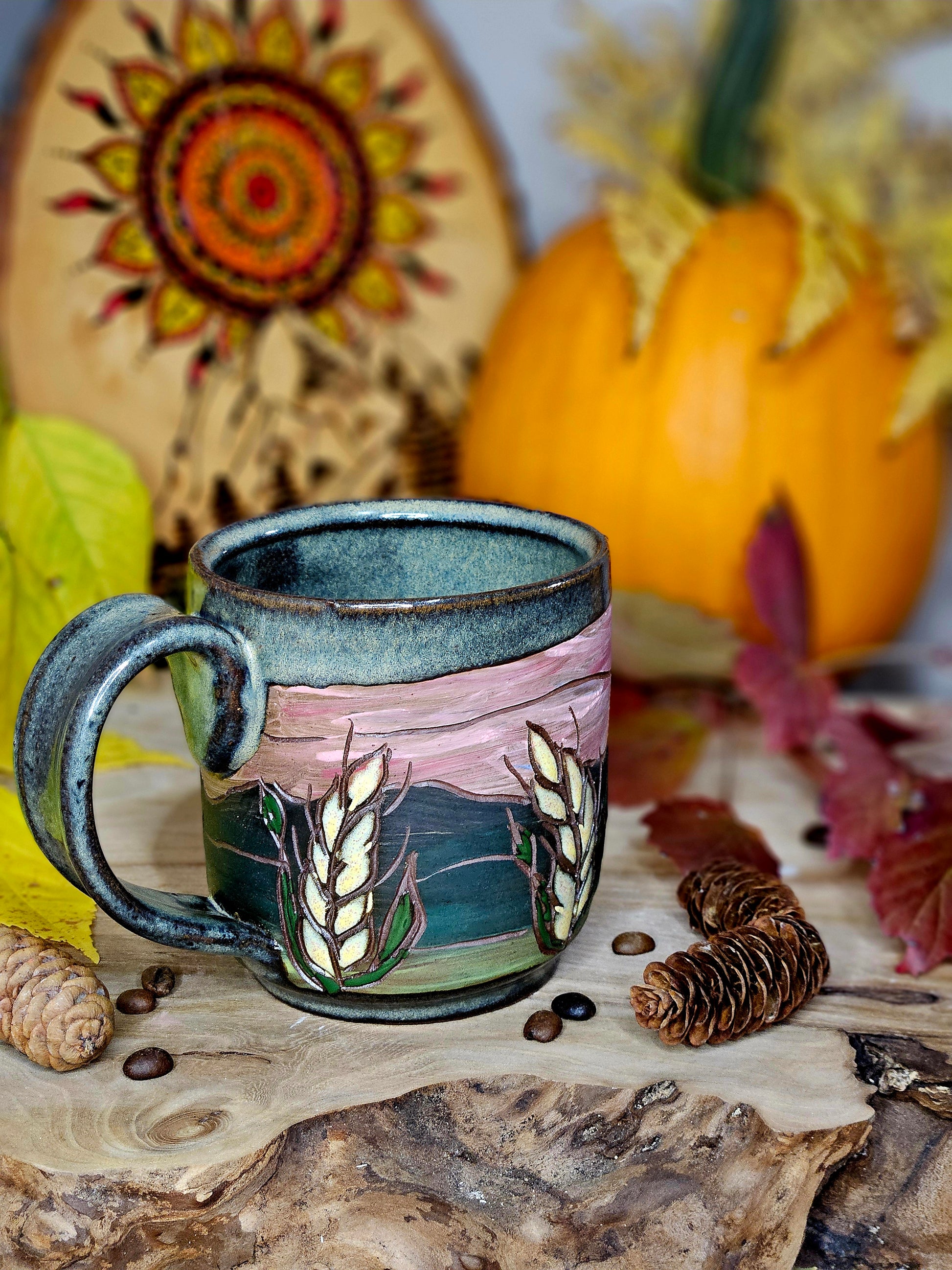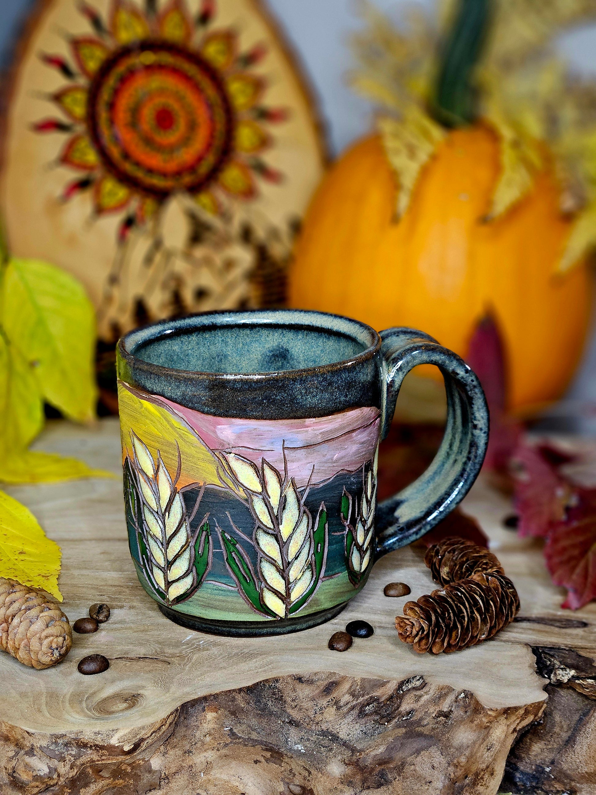 Elevate your coffee ritual with this handcrafted pottery mug. Each mug boasts 4-8 hours of custom art work, making every piece one-of-a-kind. Its ergonomic handle and generous capacity (13-16oz) provide both comfort and functionality. Perfect for cozy mornings or afternoon tea, this mug adds artisanal charm to any home.