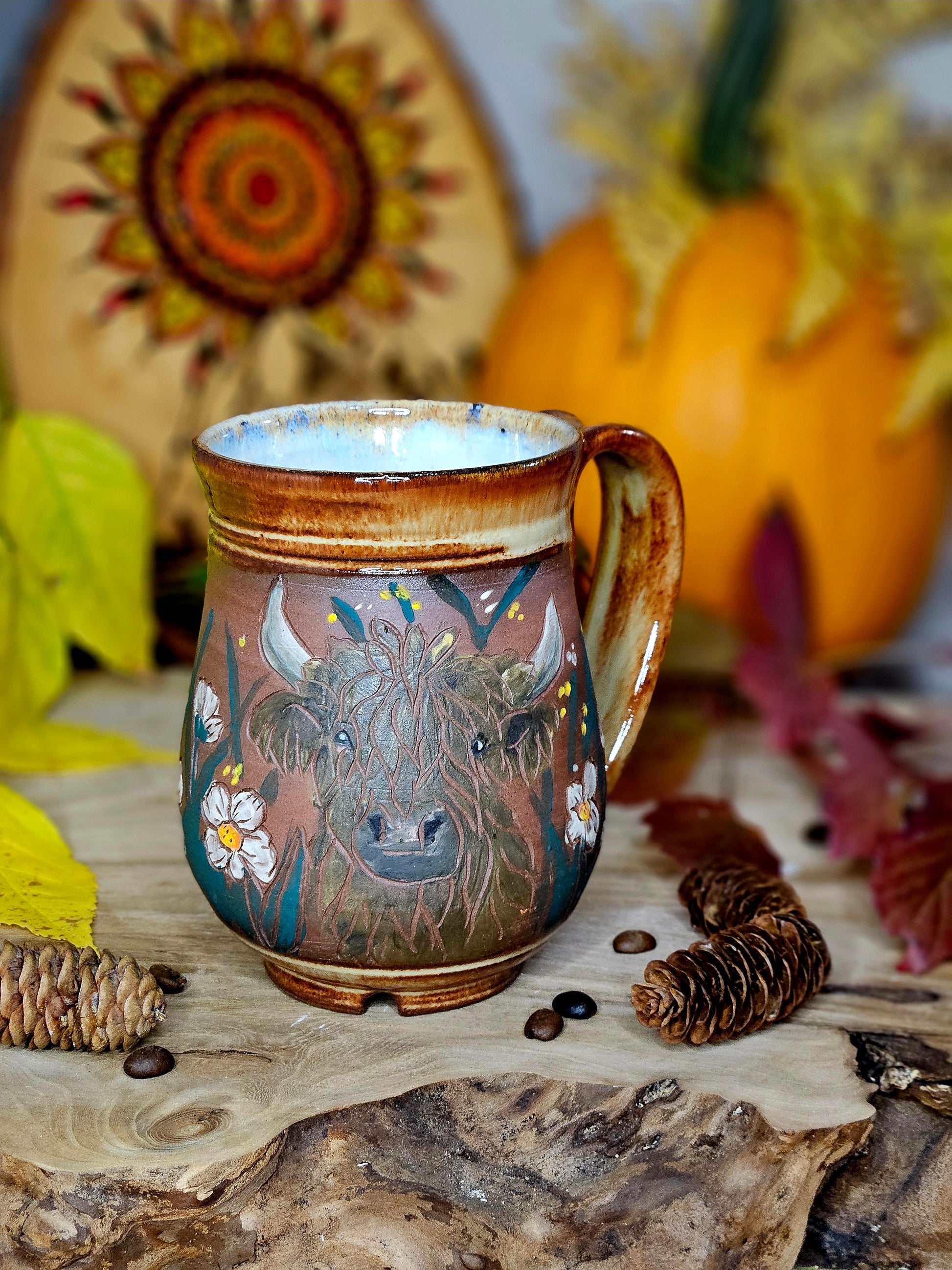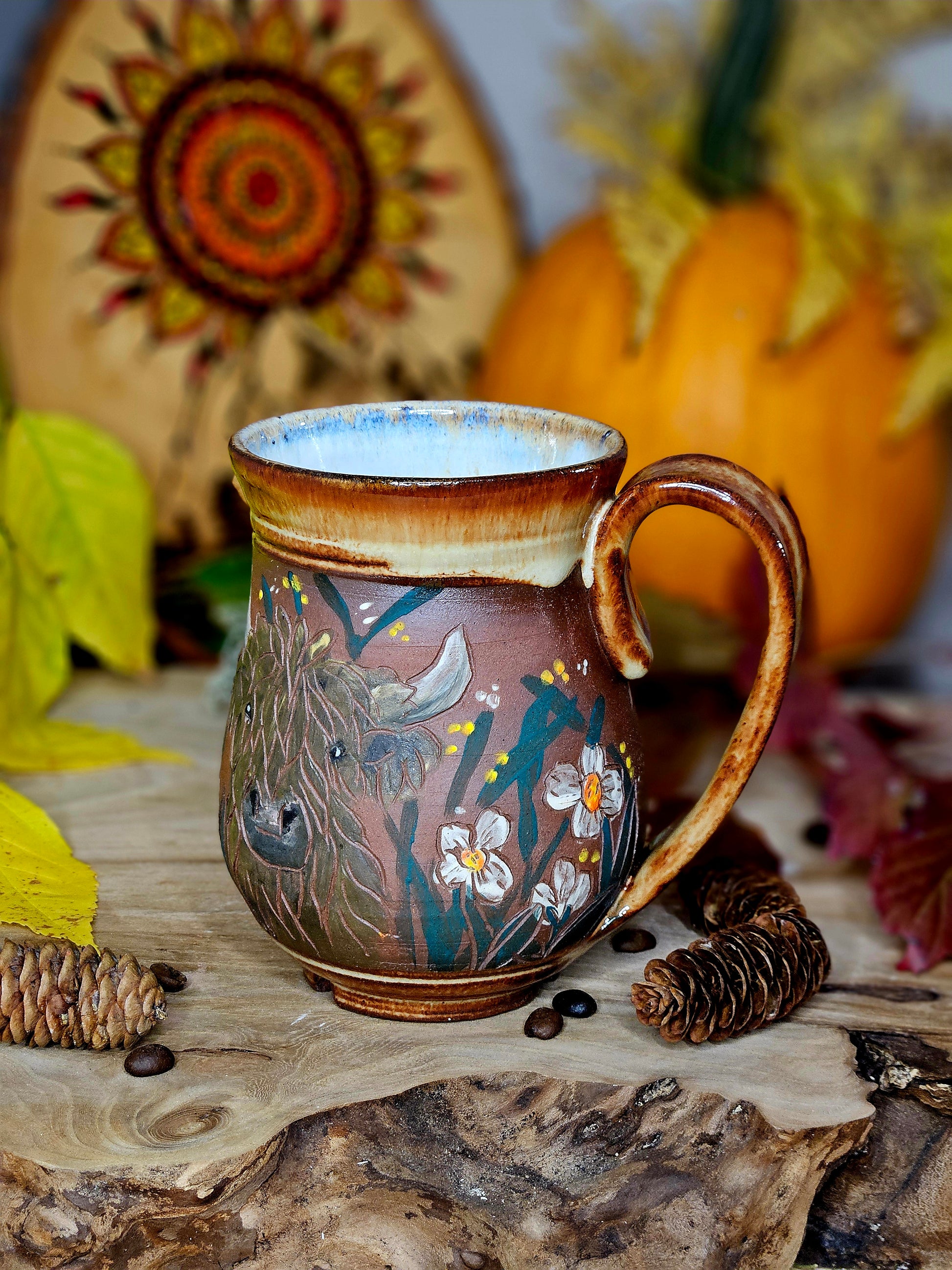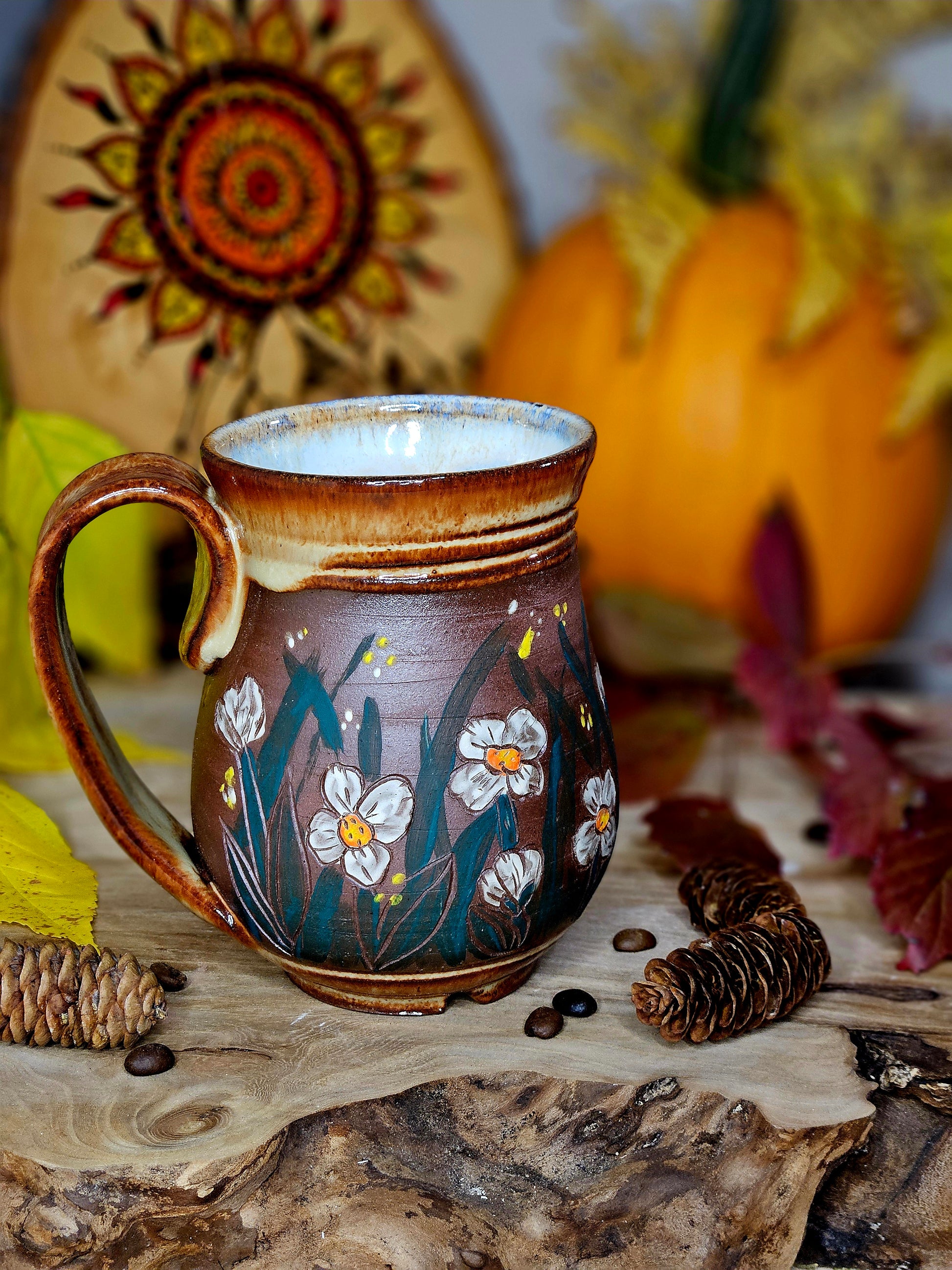 Elevate your coffee ritual with this handcrafted pottery mug. Each mug boasts 4-8 hours of custom art work, making every piece one-of-a-kind. Its ergonomic handle and generous capacity (13-16oz) provide both comfort and functionality. Perfect for cozy mornings or afternoon tea, this mug adds artisanal charm to any home.