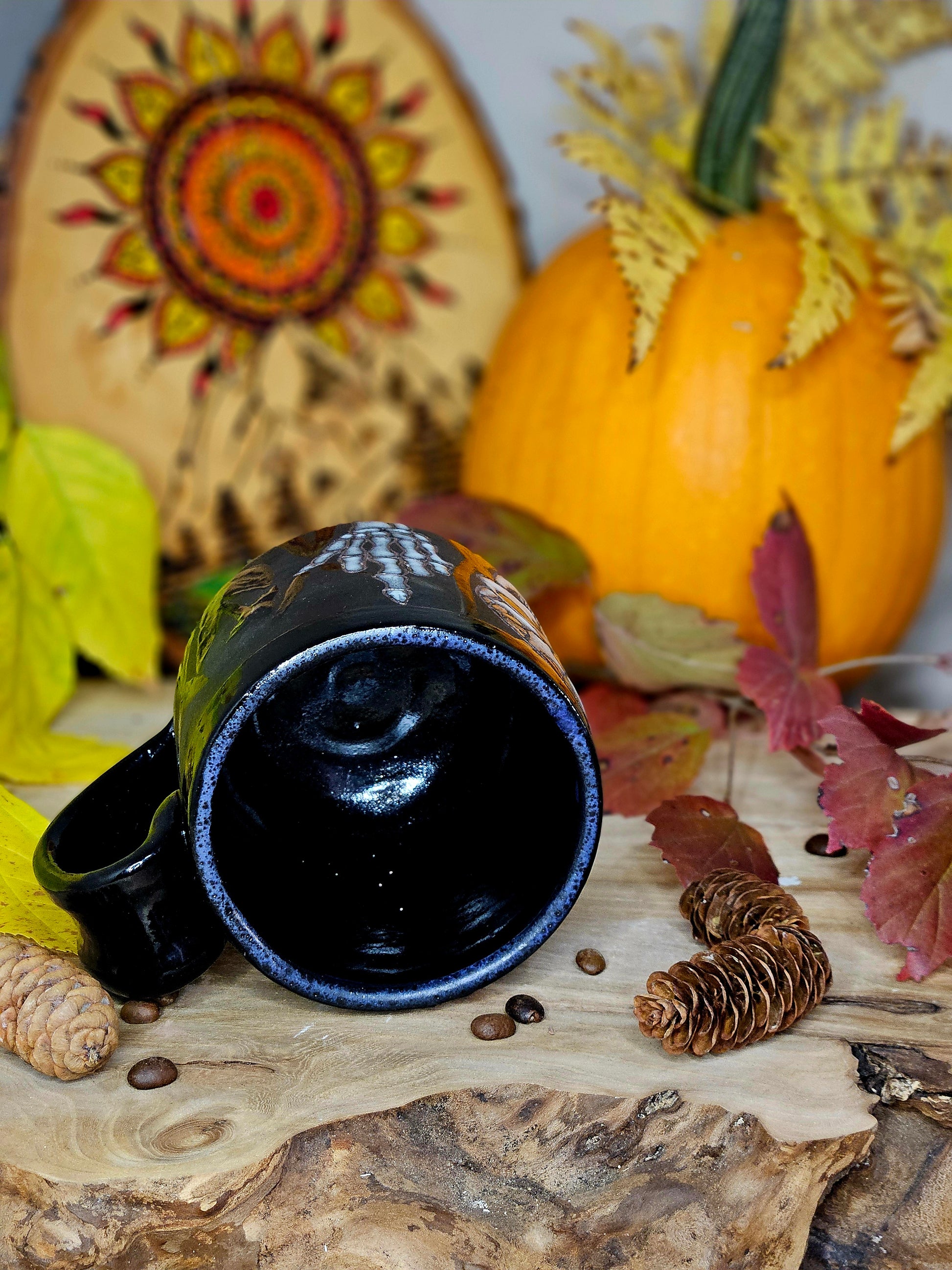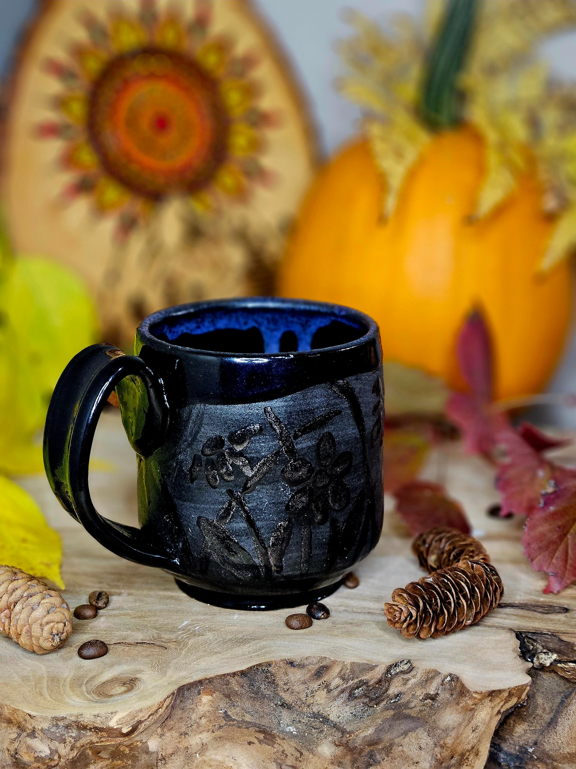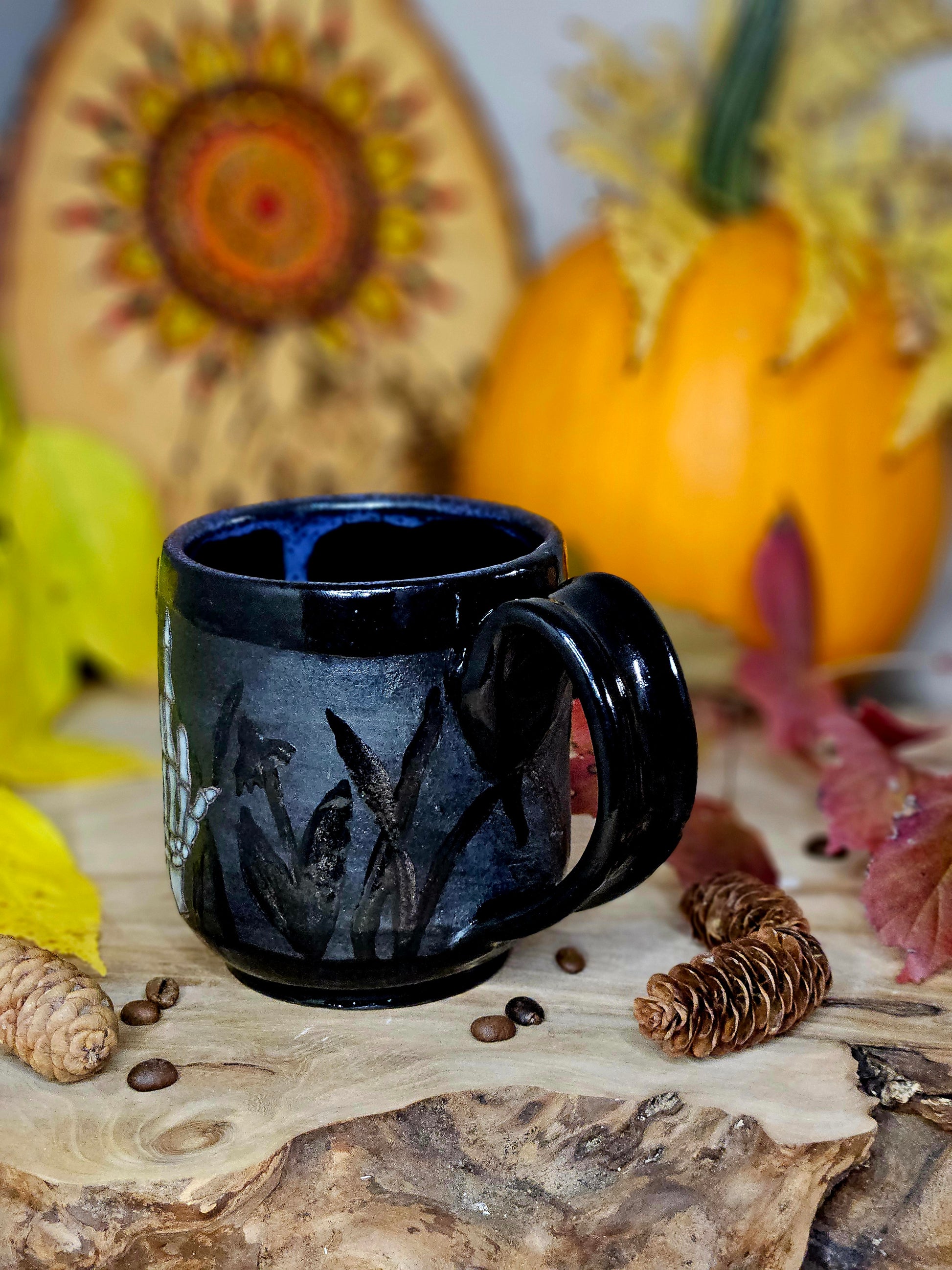 Elevate your coffee ritual with this handcrafted pottery mug. Each mug boasts 4-8 hours of custom art work, making every piece one-of-a-kind. Its ergonomic handle and generous capacity (13-16oz) provide both comfort and functionality. Perfect for cozy mornings or afternoon tea, this mug adds artisanal charm to any home.