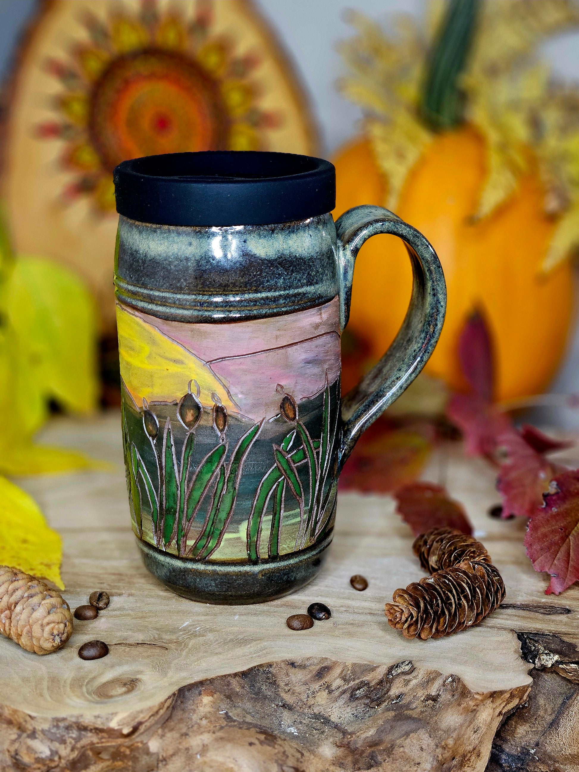 Elevate your coffee ritual with this handcrafted pottery mug. Each mug boasts 4-8 hours of custom art work, making every piece one-of-a-kind. Its ergonomic handle and generous capacity (13-16oz) provide both comfort and functionality. Perfect for cozy mornings or afternoon tea, this mug adds artisanal charm to any home.